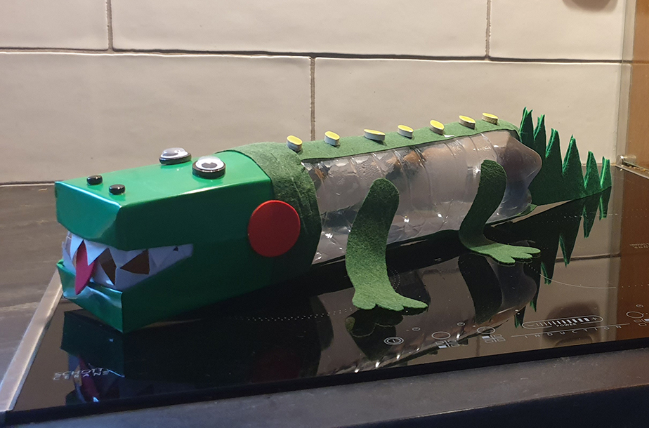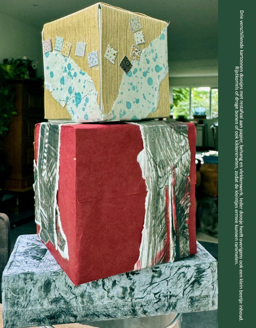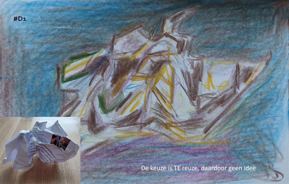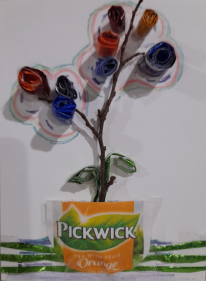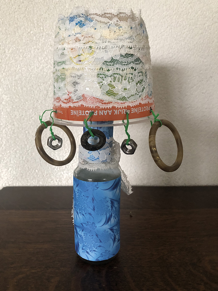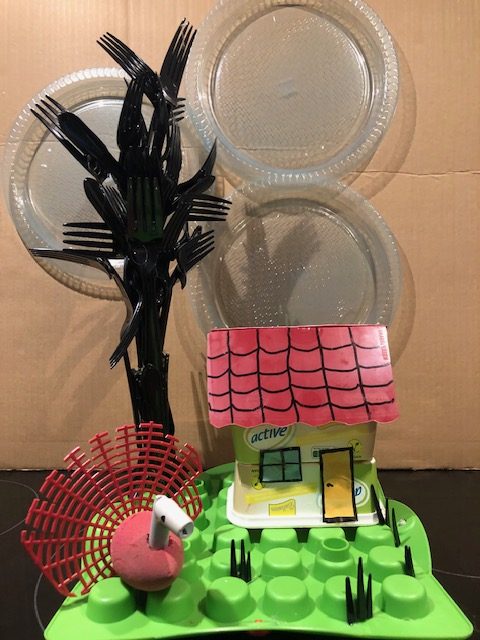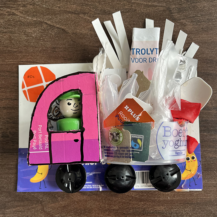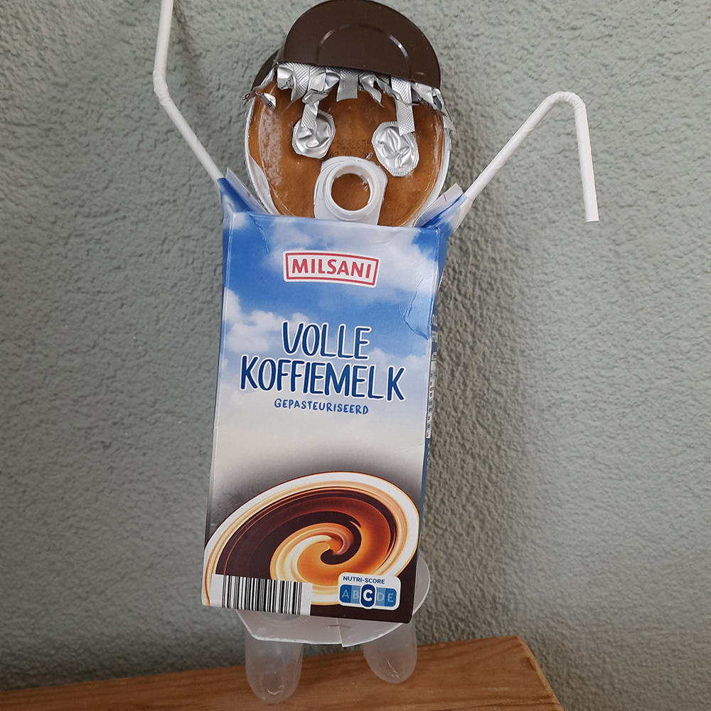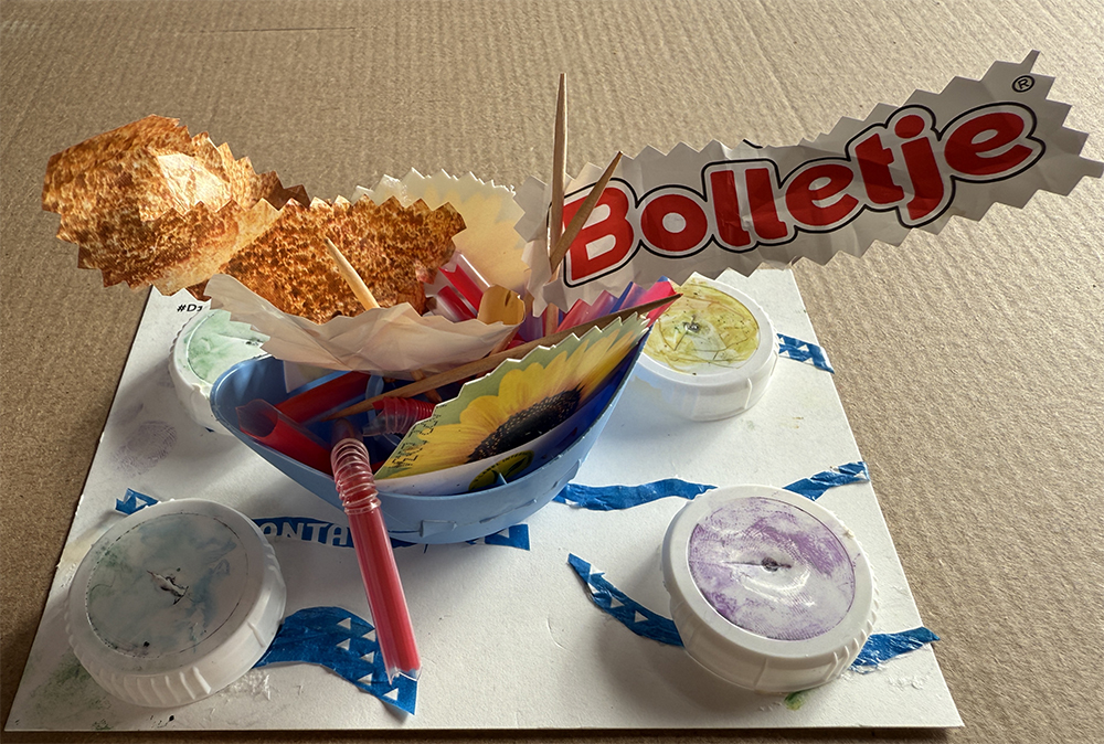 We maken een kunstwerk van afval. Alles mag worden gebruikt. Het stuk kan ruimtelijk of op papier gemaakt worden. Het is een enorme mix van leuke ideeën geworden.