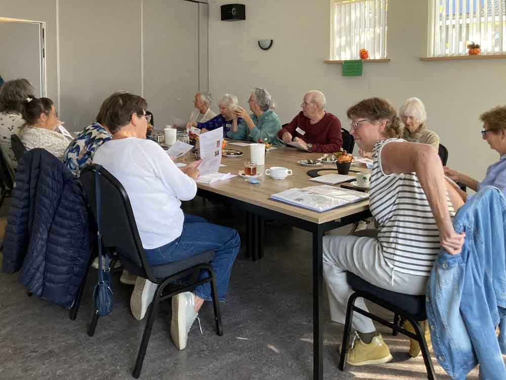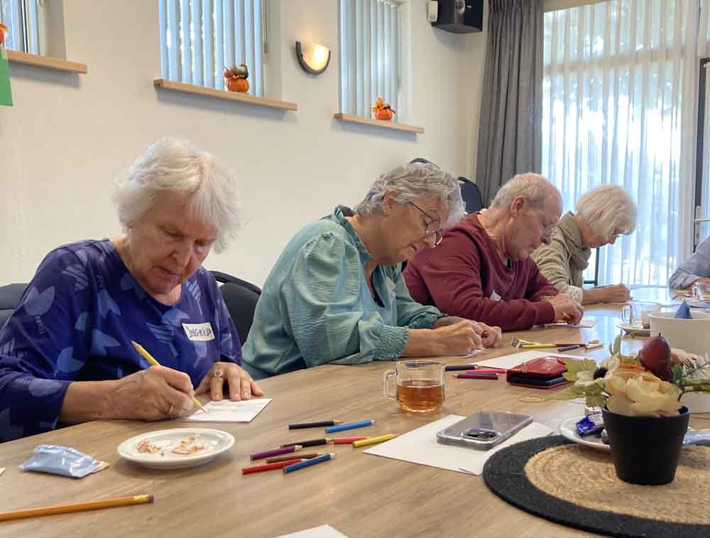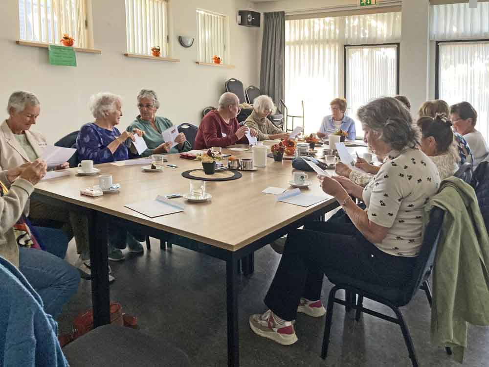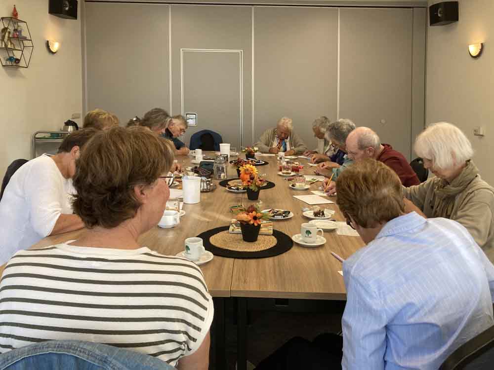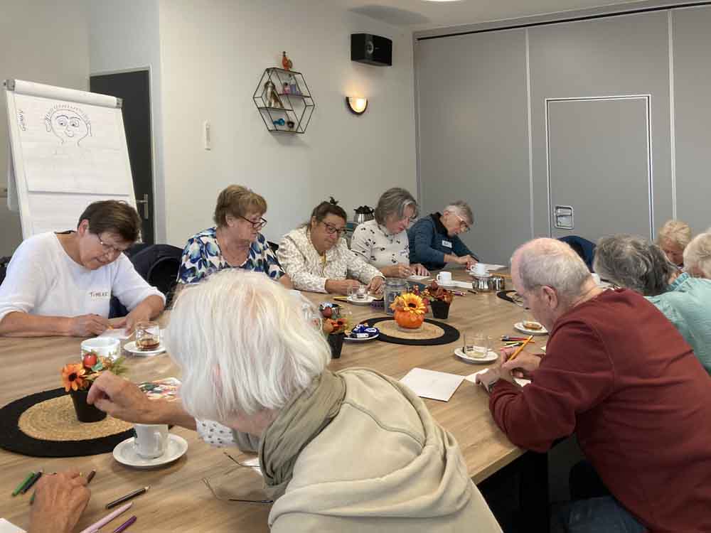 Na het gezellig kennismaken/bijpraten volgde er onder leiding van Gonny een kleine creatieve opdracht waarmee, na de aanvankelijke schrik, het hele gezelschap enthousiast aan de slag ging. Kortom, wat de werkgroep betreft een heel geslaagde ochtend!