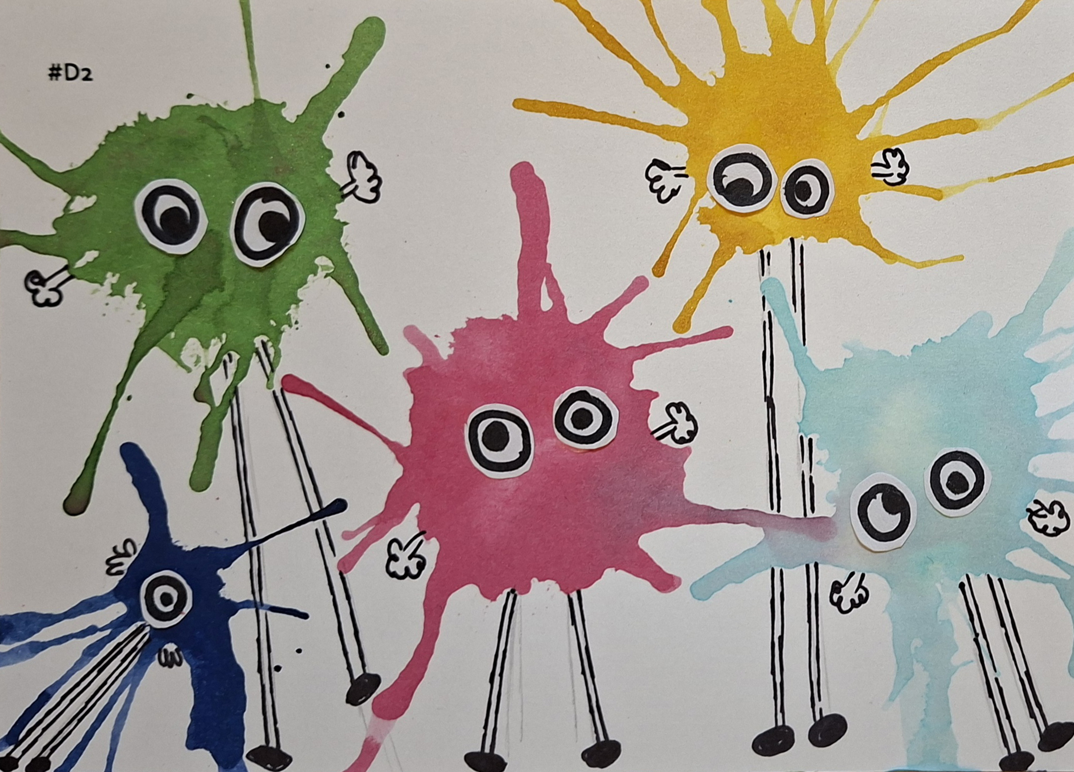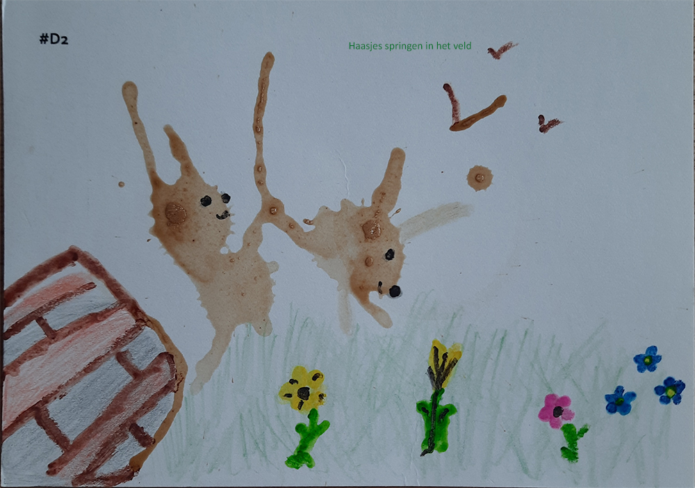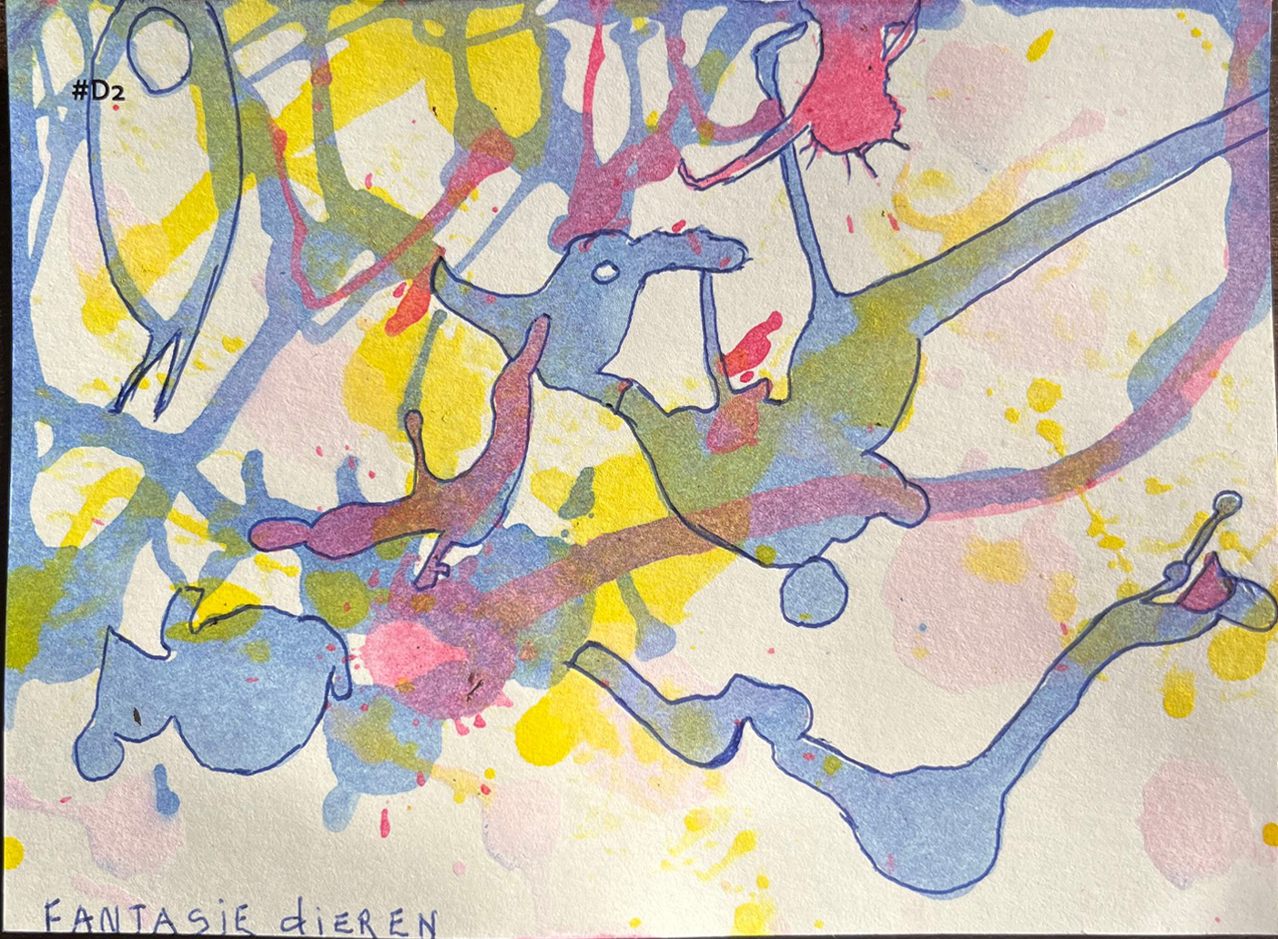 Met deze opdracht worden we uitgedaagd om vlekken te maken en deze te gebruiken als uitgangspunt voor de tekening. Met fantasie zie je hieronder hele leuke composities ontstaan.