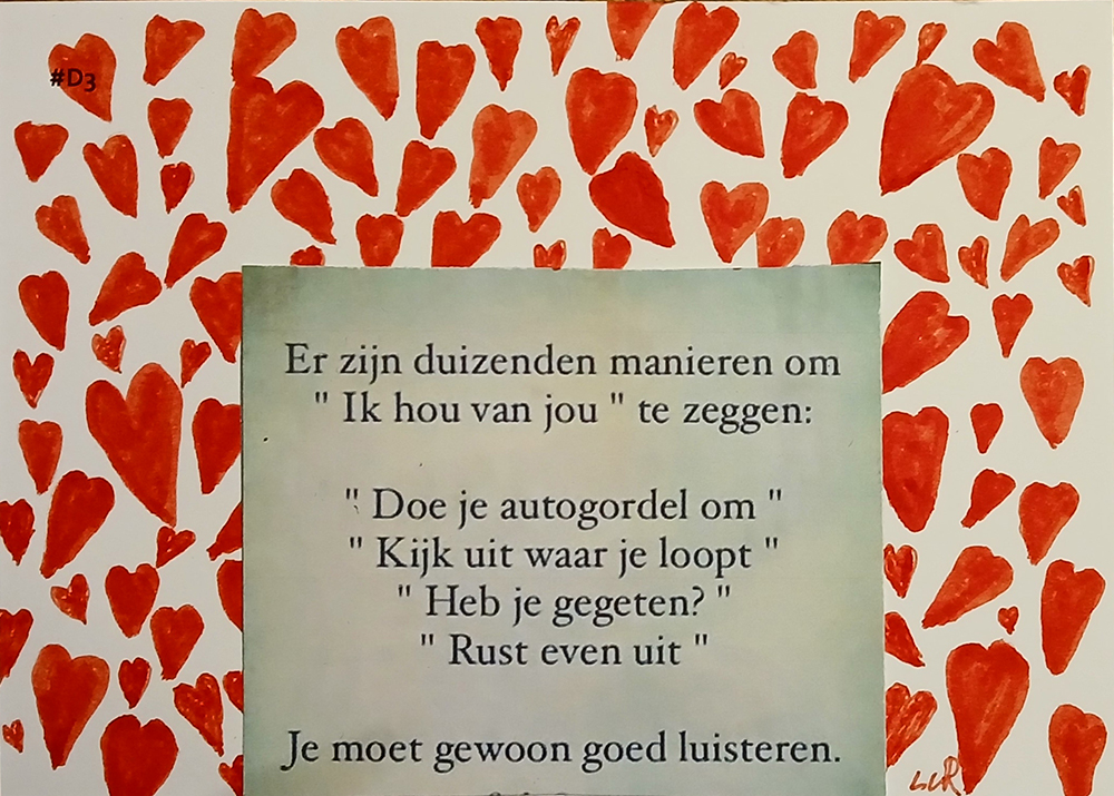 Onlangs zijn we met een groep van twintig mensen opgestart met programma D van Kunst door de Brievenbus. Alle deelnemers werden vooraf uitgenodigd om op 1 oktober in D’n Elshof een kopje koffie met iets lekkers te komen nuttigen. Om op deze wijze kennis met elkaar te kunnen maken en daarnaast de allereerste opdracht uit handen van de werkgroep te mogen ontvangen.