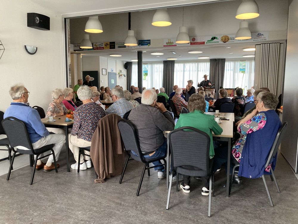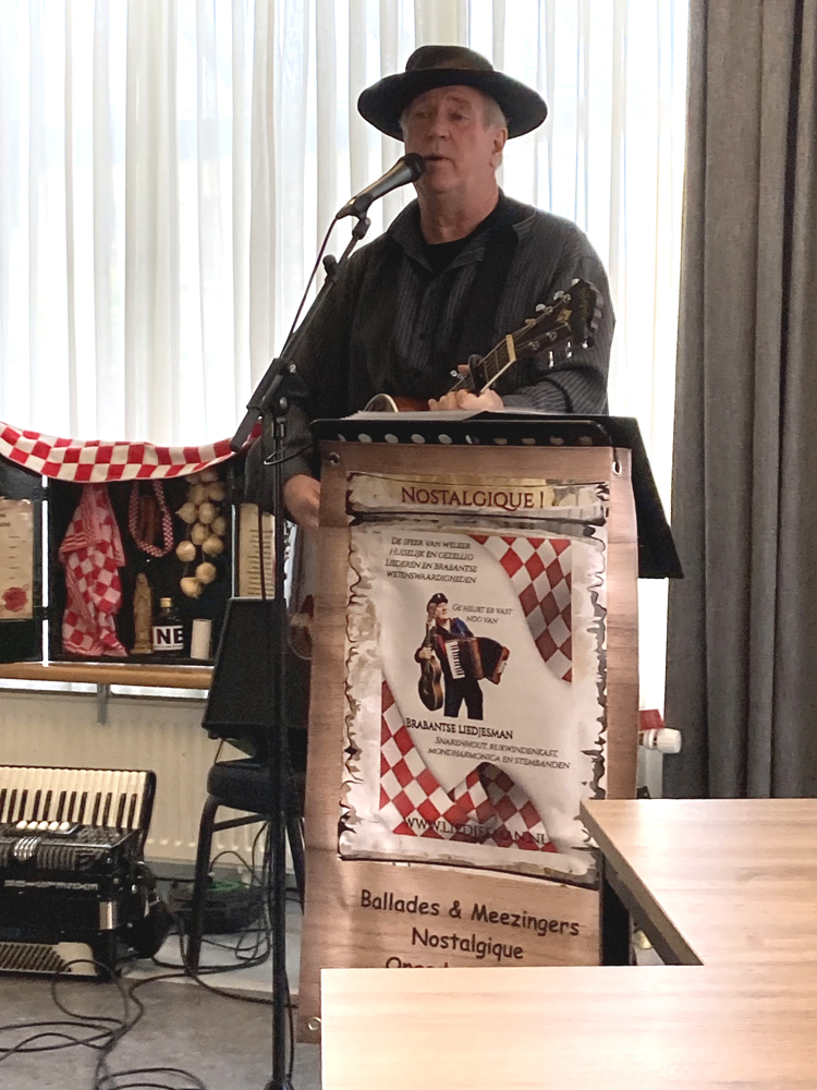 Gezelligheid op Ouderendag. Vrijdag 6 oktober, Ouderen dag en wat is er leuker dan samen onder het genot van een drankje te luisteren naar Liedjesman Frank van Es die met gitaar en accordeon de boel komt vermaken met een Brabants getint programma. En waarbij ook nog volop meegezongen mag worden. Vijftig personen zaten al vroeg klaar om te genieten van wat deze troubadour te bieden had.. Na wat over zichzelf verteld te hebben kwam de gitaar tevoorschijn en kon het meezingen beginnen. In het begin voorzichtig maar later uit volle borst. Uiteraard als eerste een liedje in het Brabants, het -Hee gaode mee – van Gerard van Maasakkers. Vooral de ouderen onder de mensen konden zich nog wel een aantal liedjes herinneren vanuit hun schooltijd maar ook liedjes als het – Brabant- en het – kleine café – kwamen voorbij. Bij de “twee eenzame cowboys” zei hij nog dat, wie zich geroepen voelde om paardje te gaan rijden, zich niet in moest houden. Maar helaas, niemand voelde zich geroepen. Keetje Tippel en de tante uit Marokko waren ook oude bekenden en voor de enige Henk in het gezelschap: Henk is een lollige vent. Sommige liederen kregen ook de uitleg mee over het ontstaan van dat lied. Bij een lied waarvan hij de woorden veranderd had moest er hulp komen uit het publiek om de tekst van het refrein op te houden. Dit werd door twee dames met veel plezier gedaan. Vanwege de Amsterdamse roots van een van de dames werd er ook nog een Amsterdams liedje gezongen. Inmiddels kwamen de drankjes op tafel en kwam de stemming er goed in.