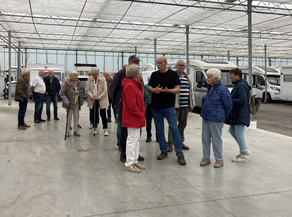 Bij de Bron/Maasroute werken ongeveer 50 seizoenarbeiders, veelal uit het buitenland maar wel jaarlijks dezelfde die terugkeren om te komen plukken. Soms met een gezin. 260 rijen met tomatenplanten, een oerwoud om door te kijken. Heel wat meters worden hier afgelegd daar was iedereen het wel over eens. Toch weer een leerzame middag voor KBO.