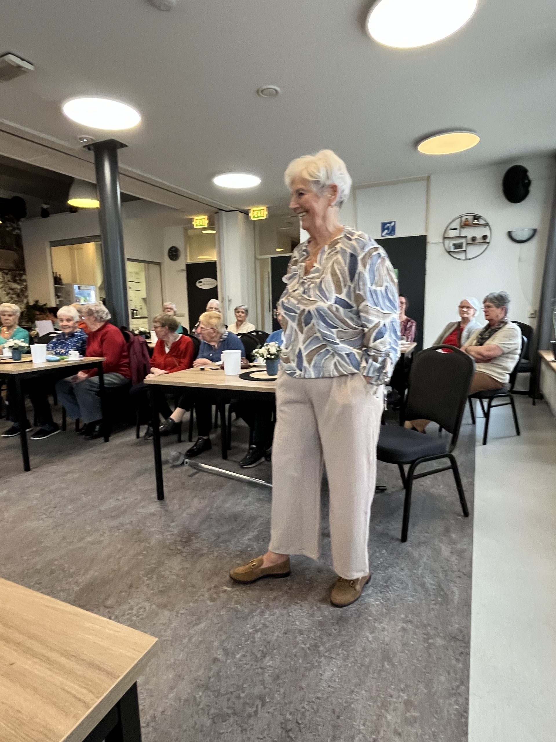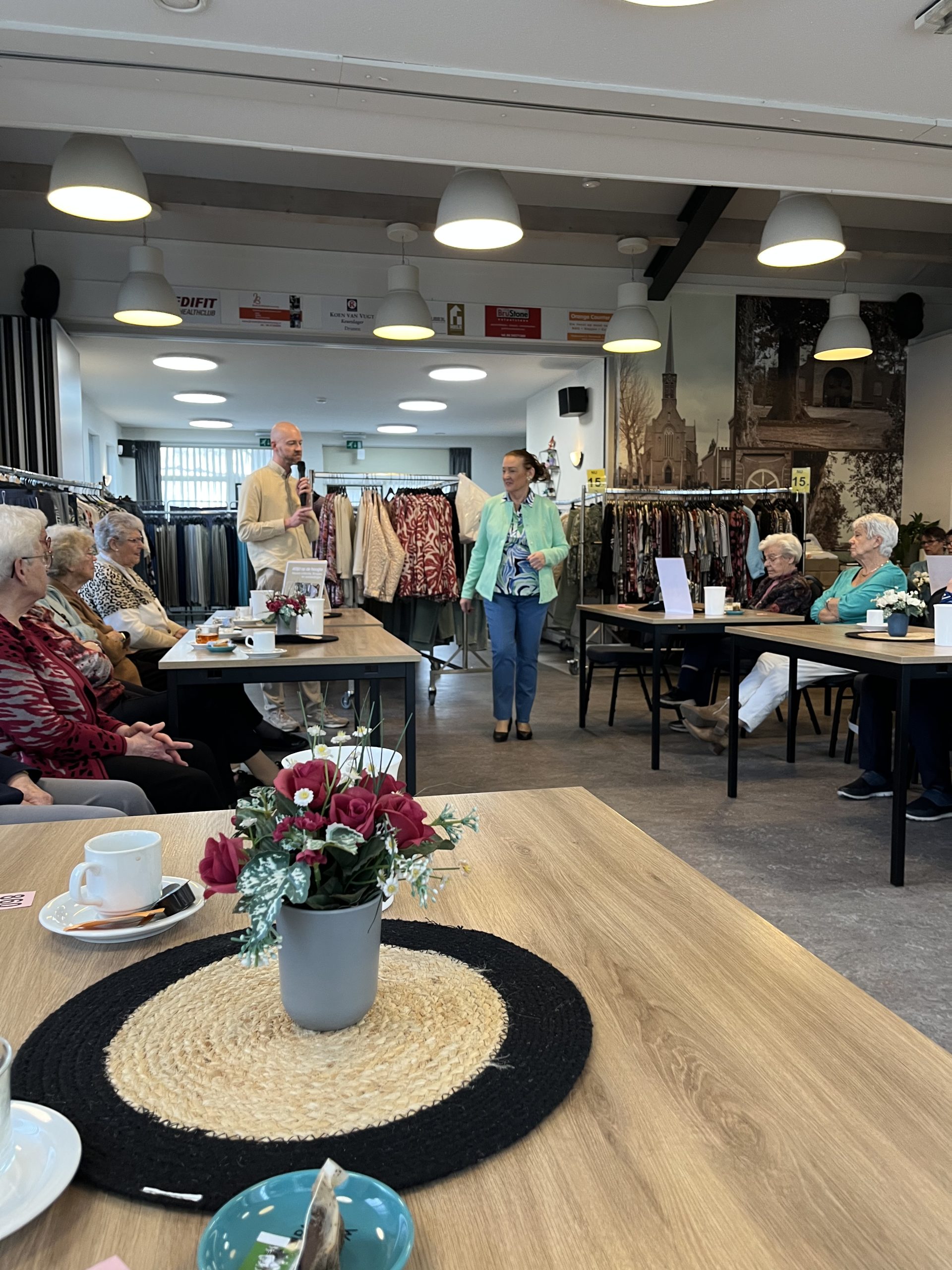 Zo’n 35 dames waren vrijdag 27 februari aanwezig. Vol verwachting wat Hoffmans mode deze keer weer voor moois bij zich had. Ruim op tijd voor Pasen was deze modeshow gepland en er was volop keuze in kleur en model.