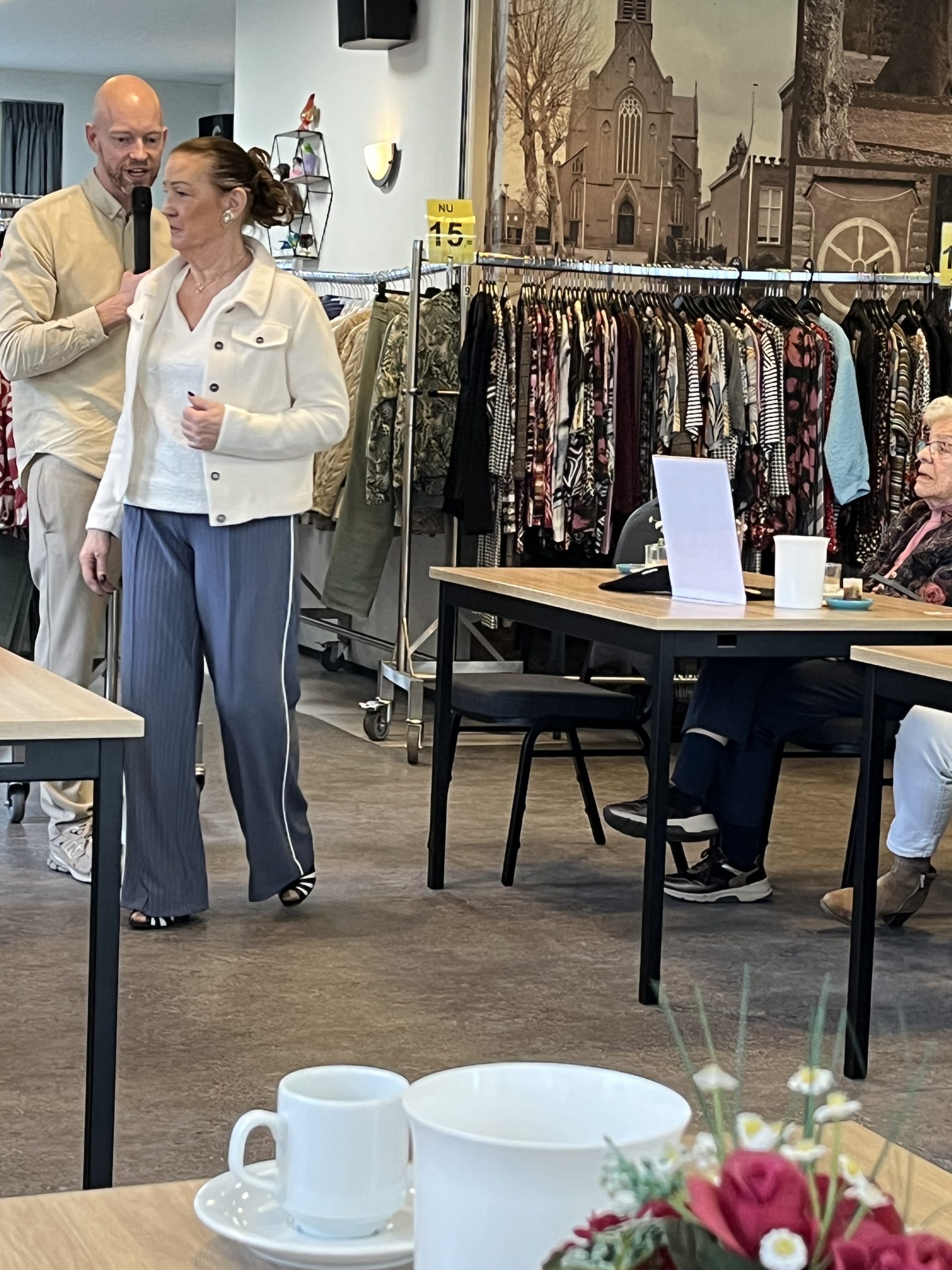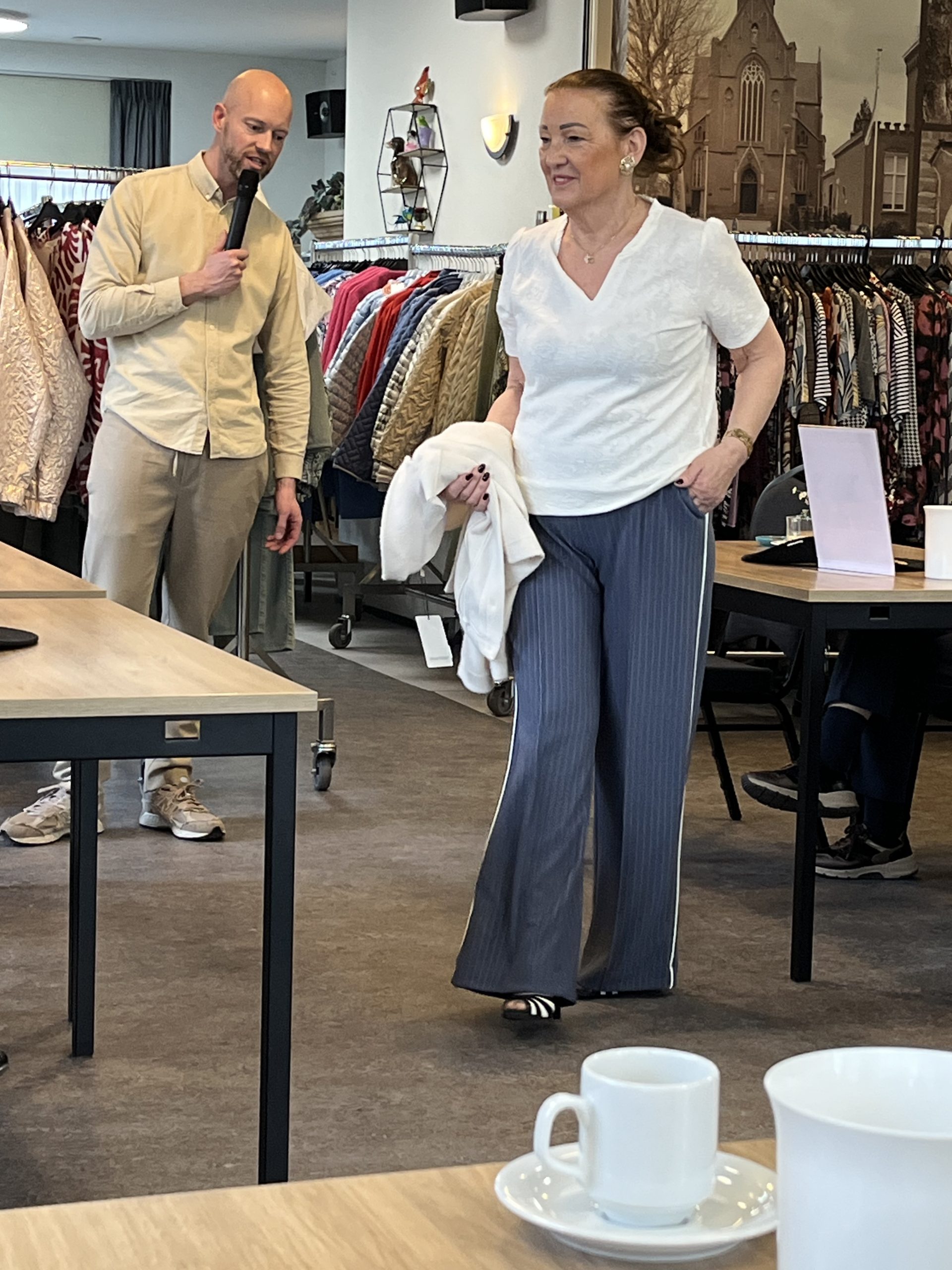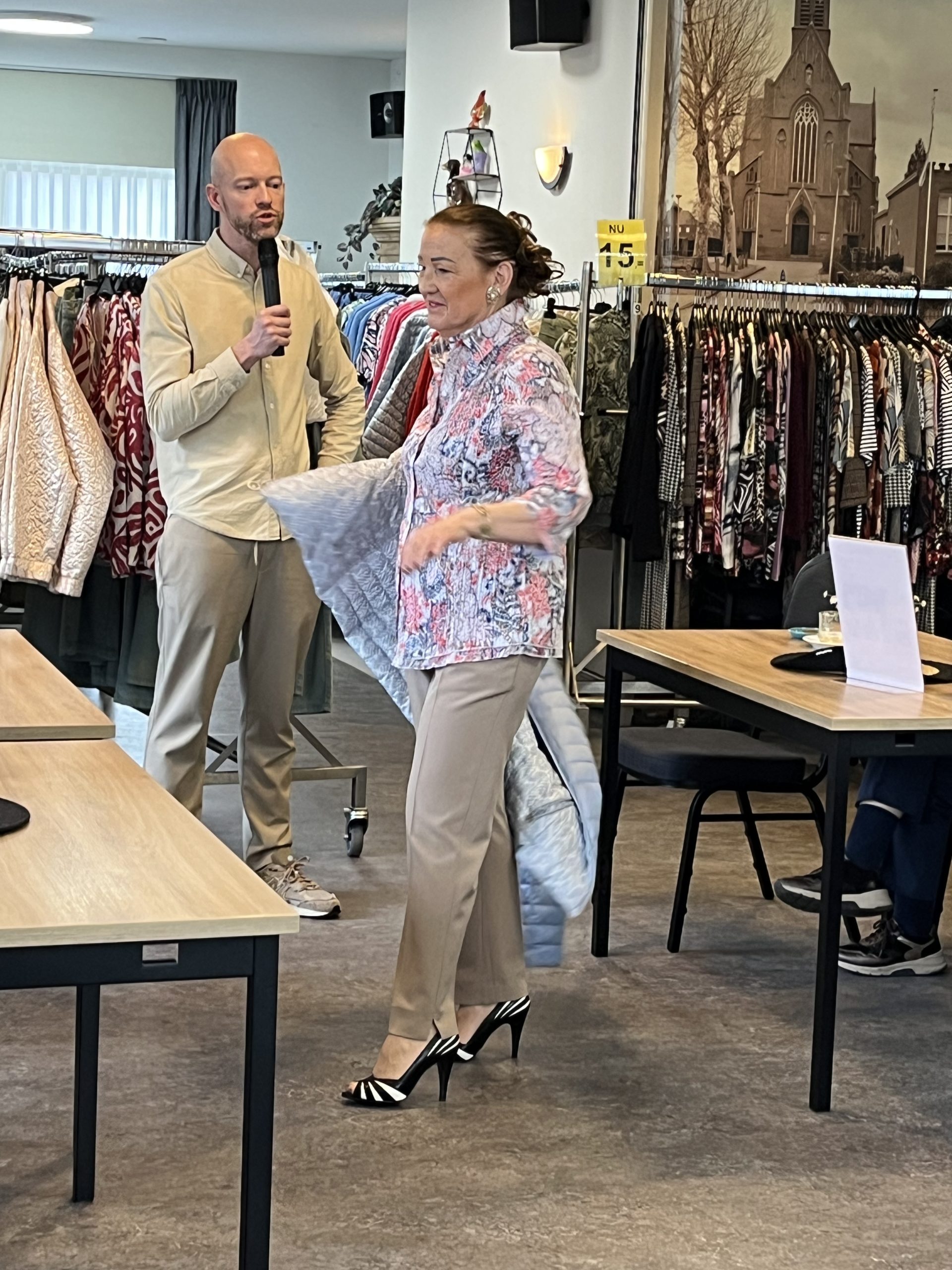Na het kopje koffie/thee kon er begonnen worden met de show. Deze werd aan elkaar gepraat door de heer Gregor Hoffmans die de stemming er goed inhield met op zijn tijd een grapje. Bij binnenkomst hadden de bezoekers een lootje gekregen voor een gratis loterij en de winnaars hiervan werden tussendoor getrokken zodat de twee dames die de kleding showden ook de tijd hadden om zich rustig om te kleden. Er waren broeken wijd en strak, blouses, shirts met druk patroon en effen, vestjasjes en natuurlijk ook zomerjassen.